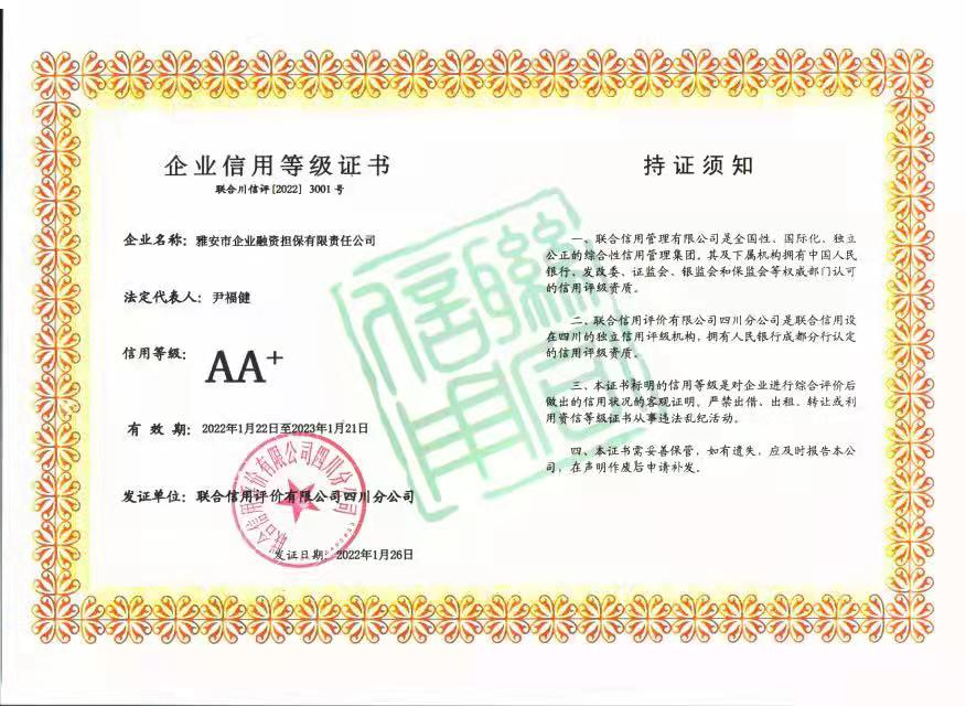 1月28日,從雅安市企業(yè)融資擔(dān)保有限責(zé)任公司(以下簡稱“市擔(dān)保公司”)傳來喜訊,經(jīng)聯(lián)合信用評(píng)價(jià)有限公司通過對(duì)市擔(dān)保公司的信用狀況進(jìn)行綜合分析和評(píng)估,確定該公司信用等級(jí)為AA+。