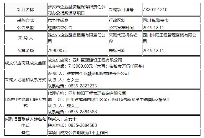 雅安市企業(yè)融資擔(dān)保有限責(zé)任公司辦公場所裝修項目競爭性磋商結(jié)果公告