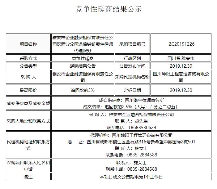 雅安市企業(yè)融資擔(dān)保有限責(zé)任公司漢源分公司追償糾紛案件律師代理服務(wù)競(jìng)爭(zhēng)性磋商結(jié)果公示